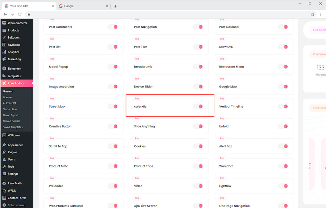 You need to install and activate the Pro version of Xpro Elementor Addons. If you already have the plugin installed, just make sure the Calendly Widget is ‘Enabled’ from the Xpro Dashboard, so you can find the widget in the Elementor editor.