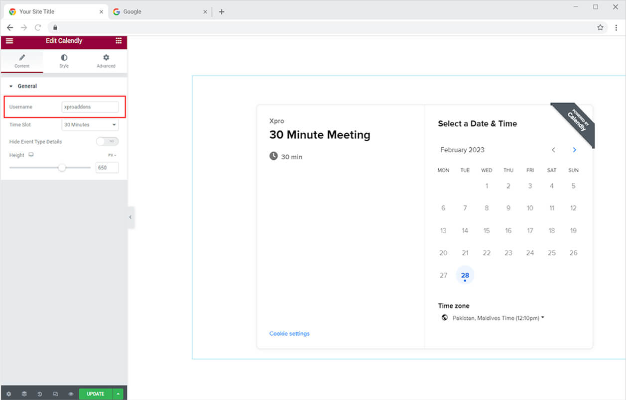 After you drop the widget into the Elementor page, write your Calendy username so that the data is automatically fetched and displayed on the screen.