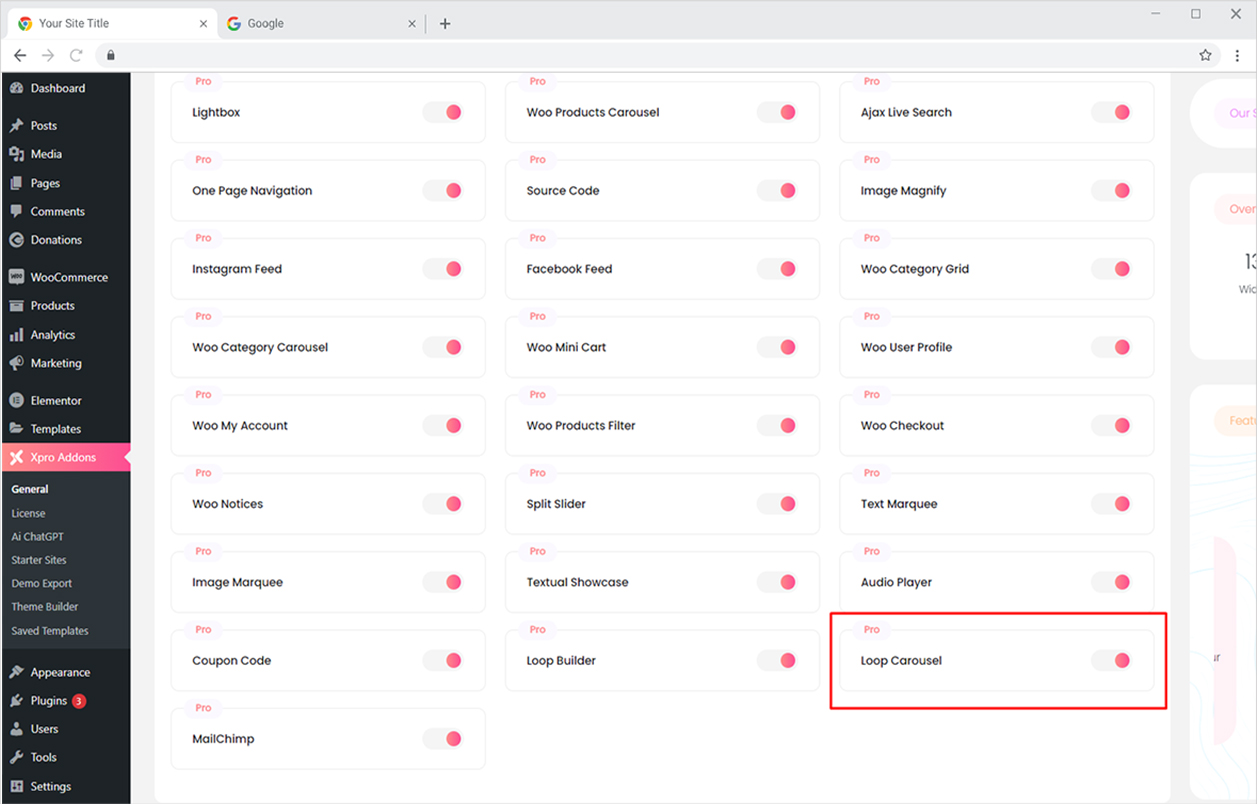 From the Xpro Addons Dashboard, click on the Widgets Tab, find the Loop Carousel widget, and finally, toggle the button ON to enable it.