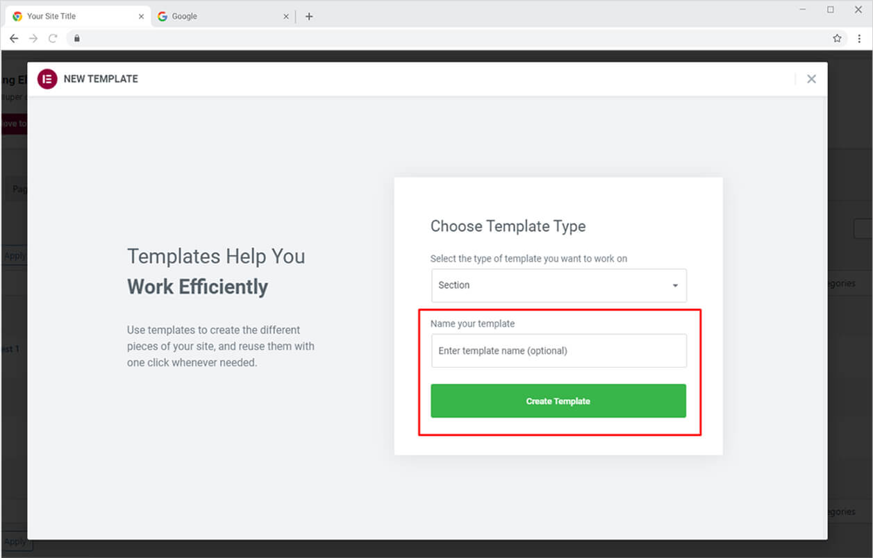 Give a name for the template so later it can be fetched by the widget. Click on the Create Template button and open an Elementor Page.