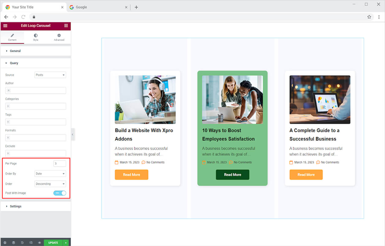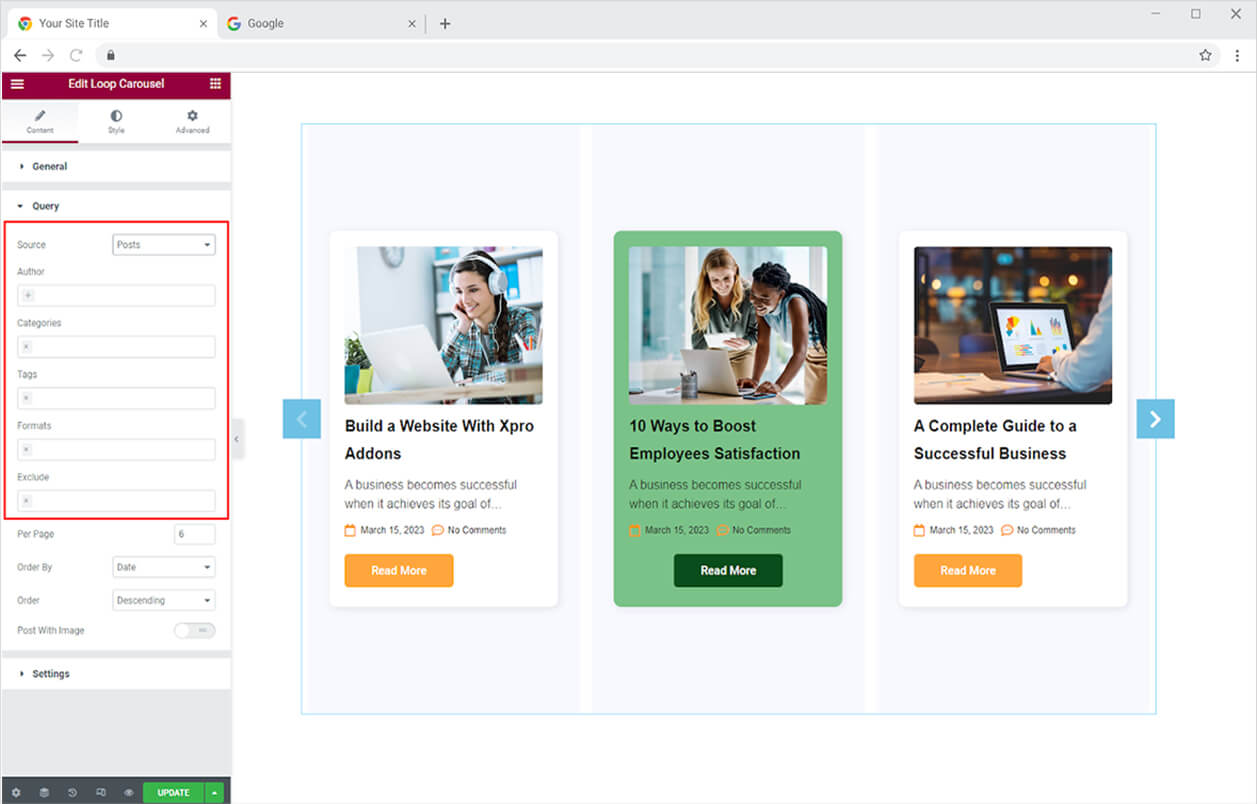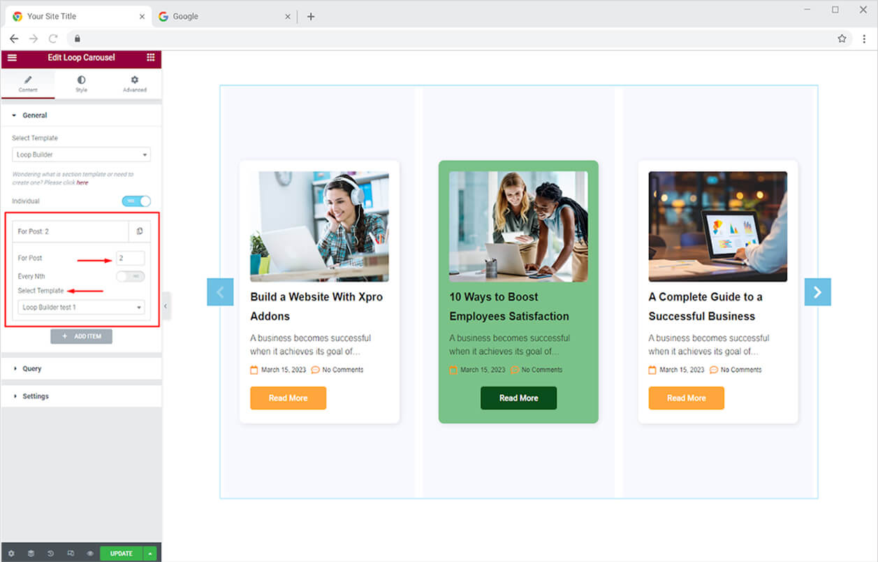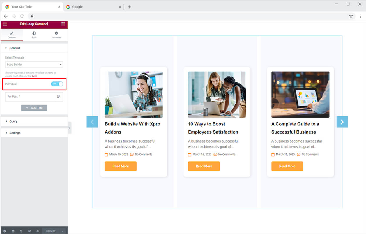 Although the Xpro Addons offer an Elementor Post Carousel widget and Elementor Woo Product Carousel widget, the loop carousel widget flexibility allows you to build the layout to your requirement. In the previous post listing widget, you have choices of up to 10 layouts to select from, however, this widget allows you to build a layout any way you want.