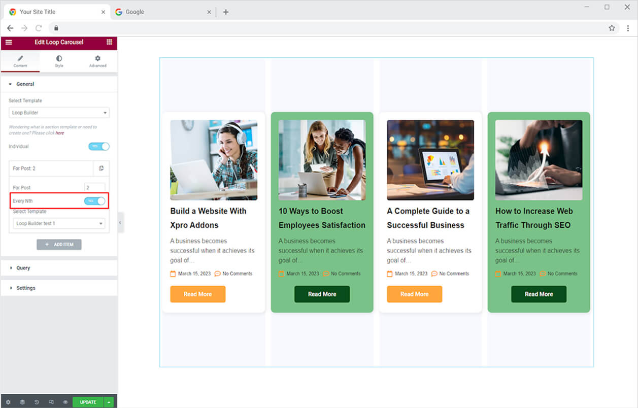 Click ‘+Add Items” to add different templates to different post lists. Or you have a feature where you can add a template to every Nth post. For Example, if you selected 2 For Post and enable the Nth option, it will change the template of every even number.