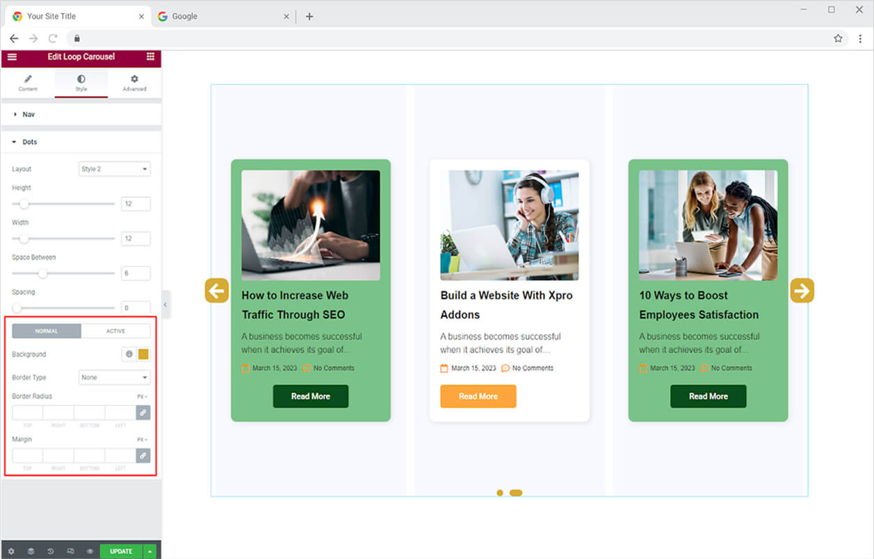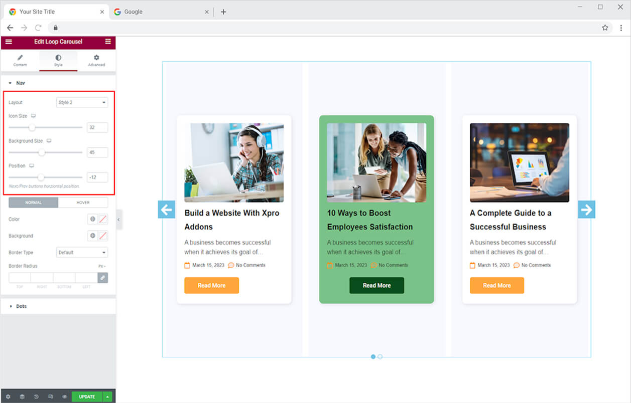 The style tab allows you to perform multiple customizations to the carousel which includes personalization of navigation and dots designs.