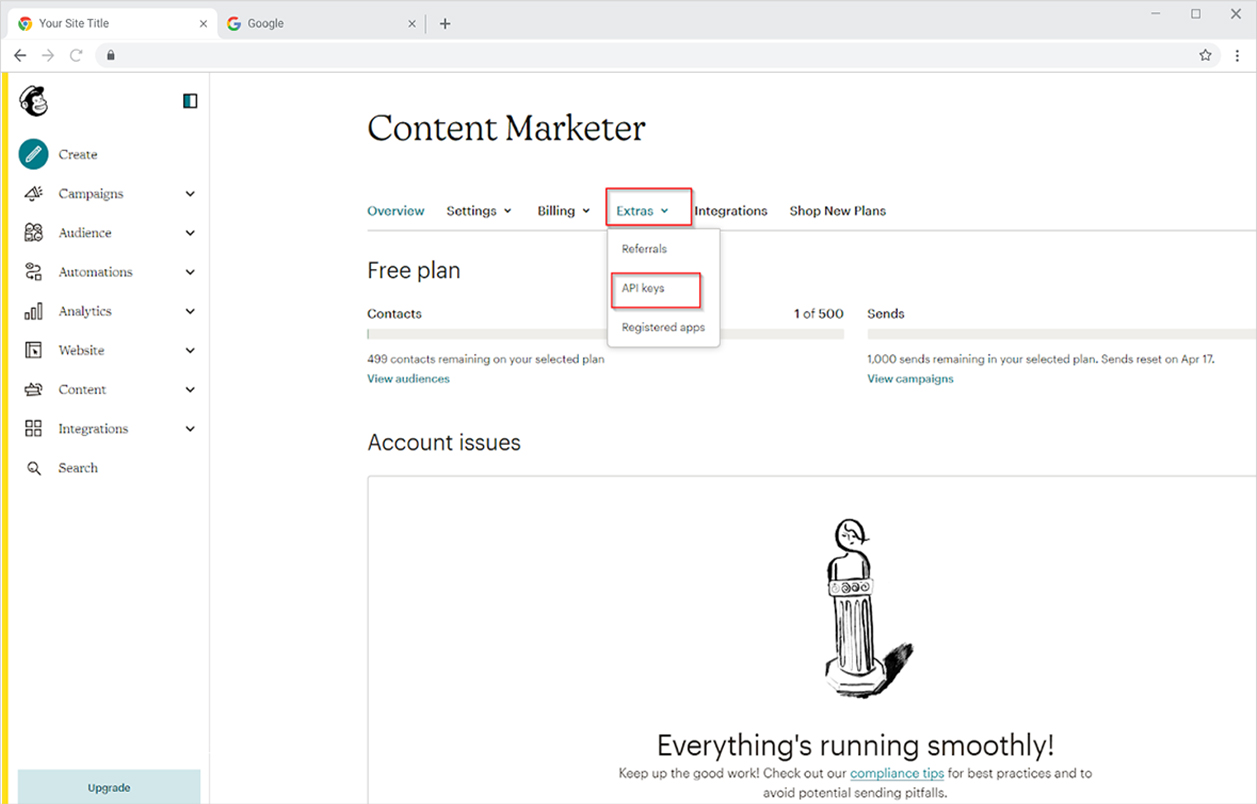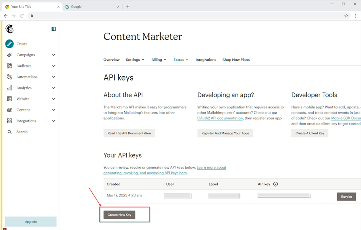 Once you signed up for your account, log in to your mailchimp account and go to the ‘account and billing’ and click on the extra menu section to choose the API key option.