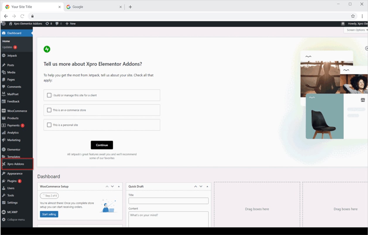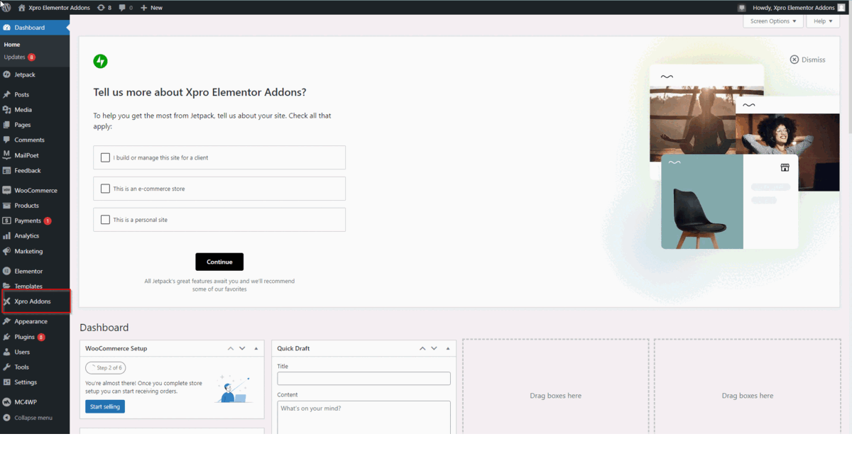 Click on the Xpro Addons option available on the WordPress Dashboard Menu.