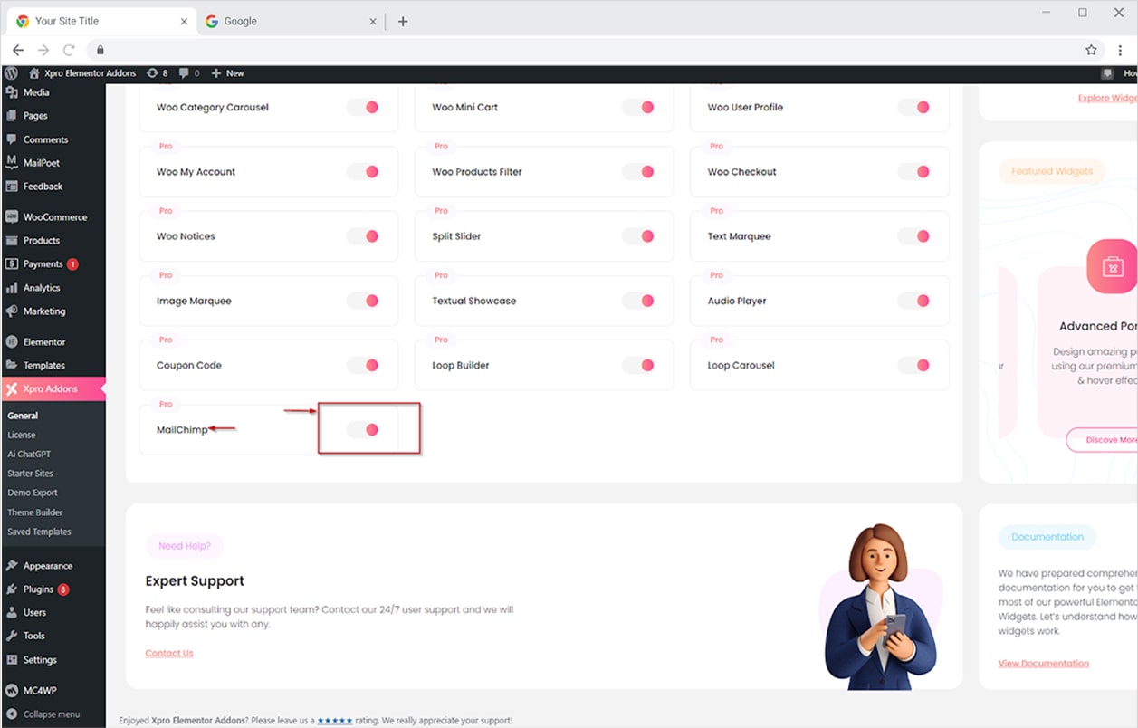 From the Xpro Addons Dashboard, click on the Widgets tab, find the Mailchimp widget, and then toggle the button ‘ON’ to enable it.