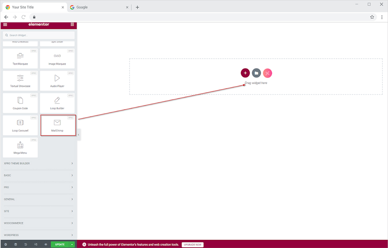 From the Xpro Addons section, find the mailchimp widget, and simply drag-drop it to your desired page location.