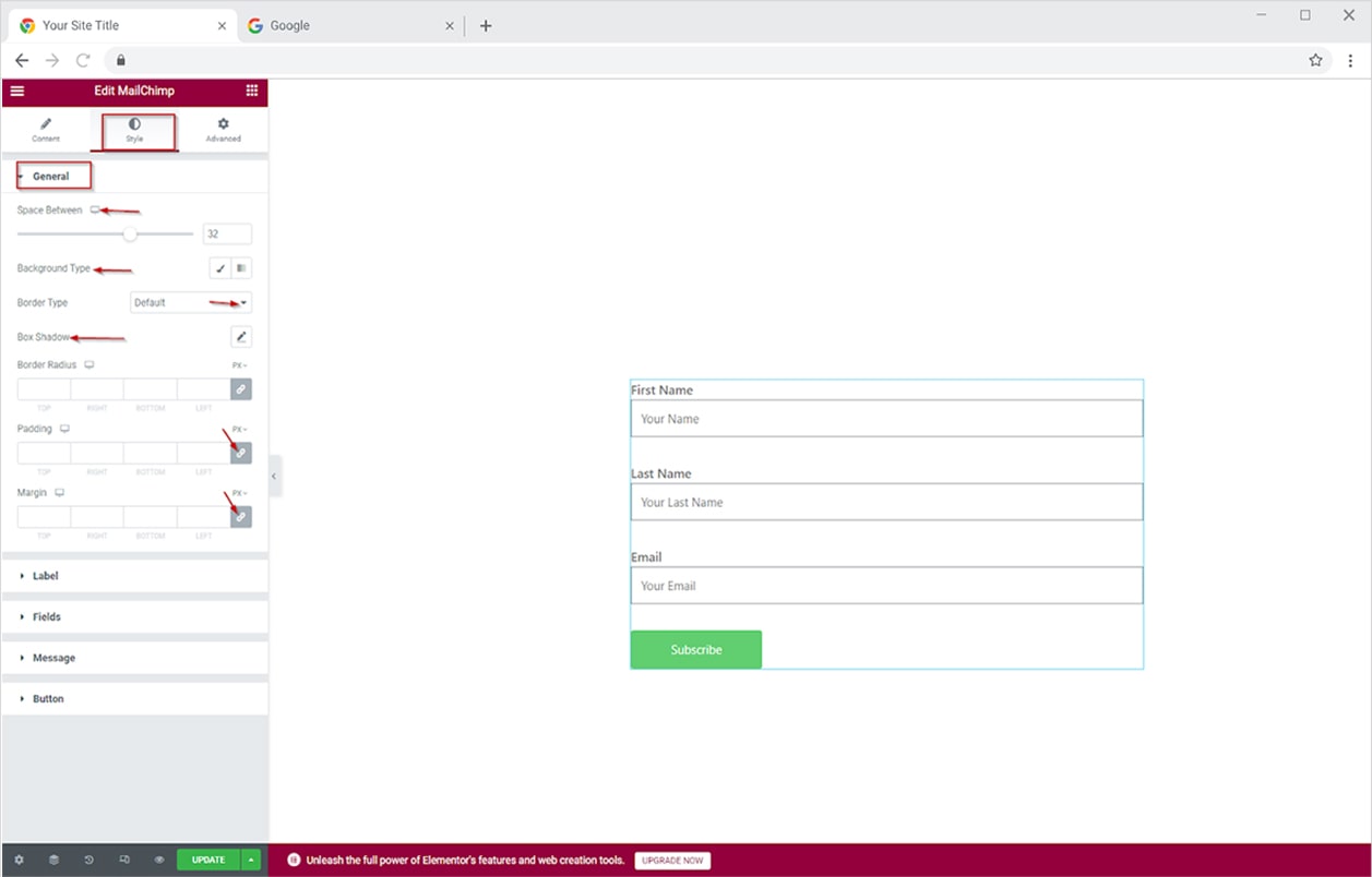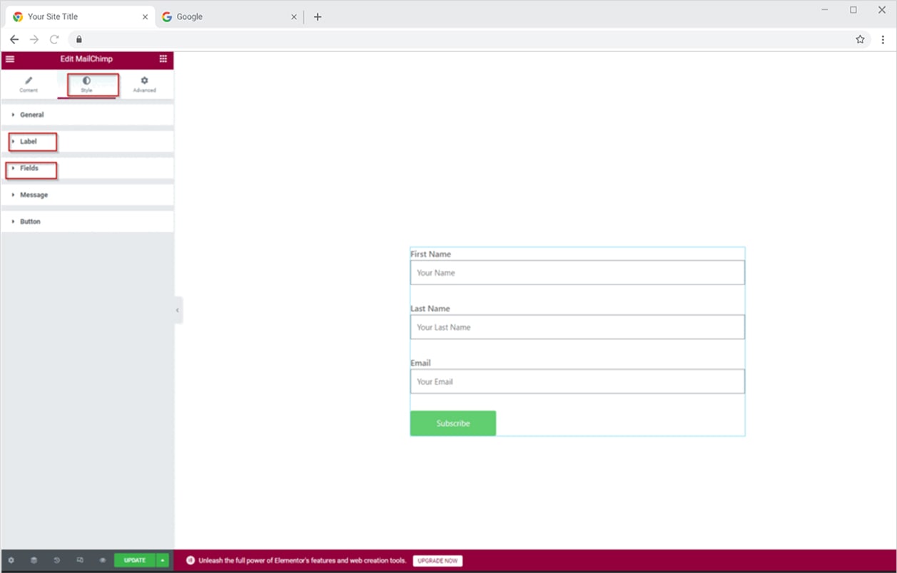 Now, let’s jump into the elementor editor and start playing with the settings for styling a high pitch mailchimp form.