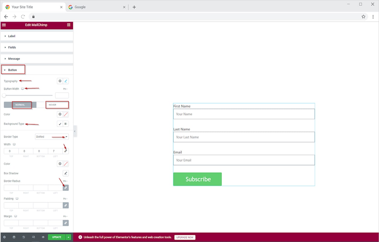 - In the button section, adjust the button width and customize typography to pop up subscribe button. You can also put a hover effect to make it visibly appealing to site visitors. In the end, adjust the border radius, and color and give padding value to stand out from other elements.