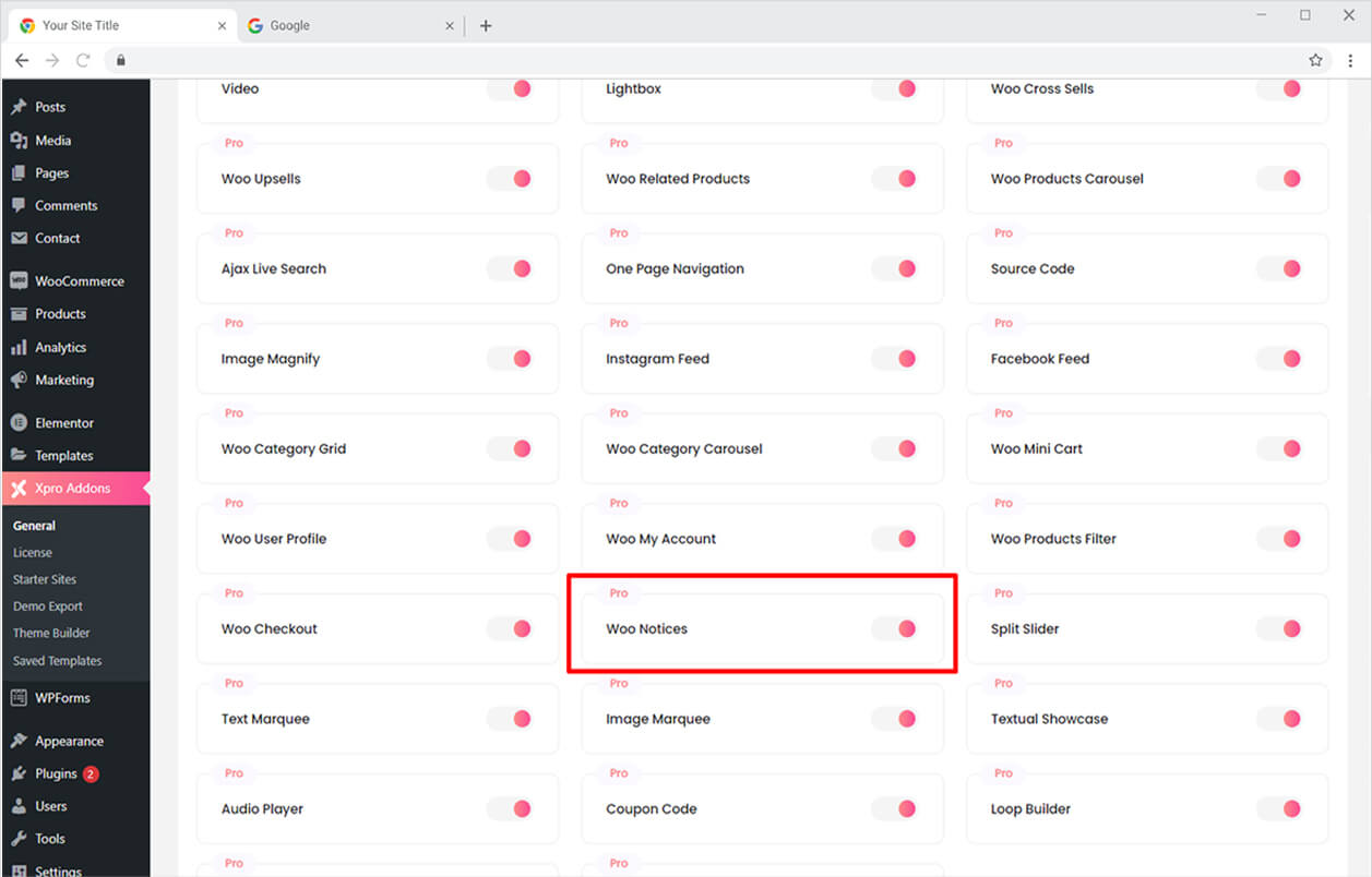 You need to download and activate the WooCommerce plugin. Also, you need to install and activate the Free version of Xpro Elementor Addons. If you already have the plugin installed, just make sure the Woo Notices Widget is ‘Enabled’ from the Xpro Dashboard so that you can find the widget in the Elementor editor.