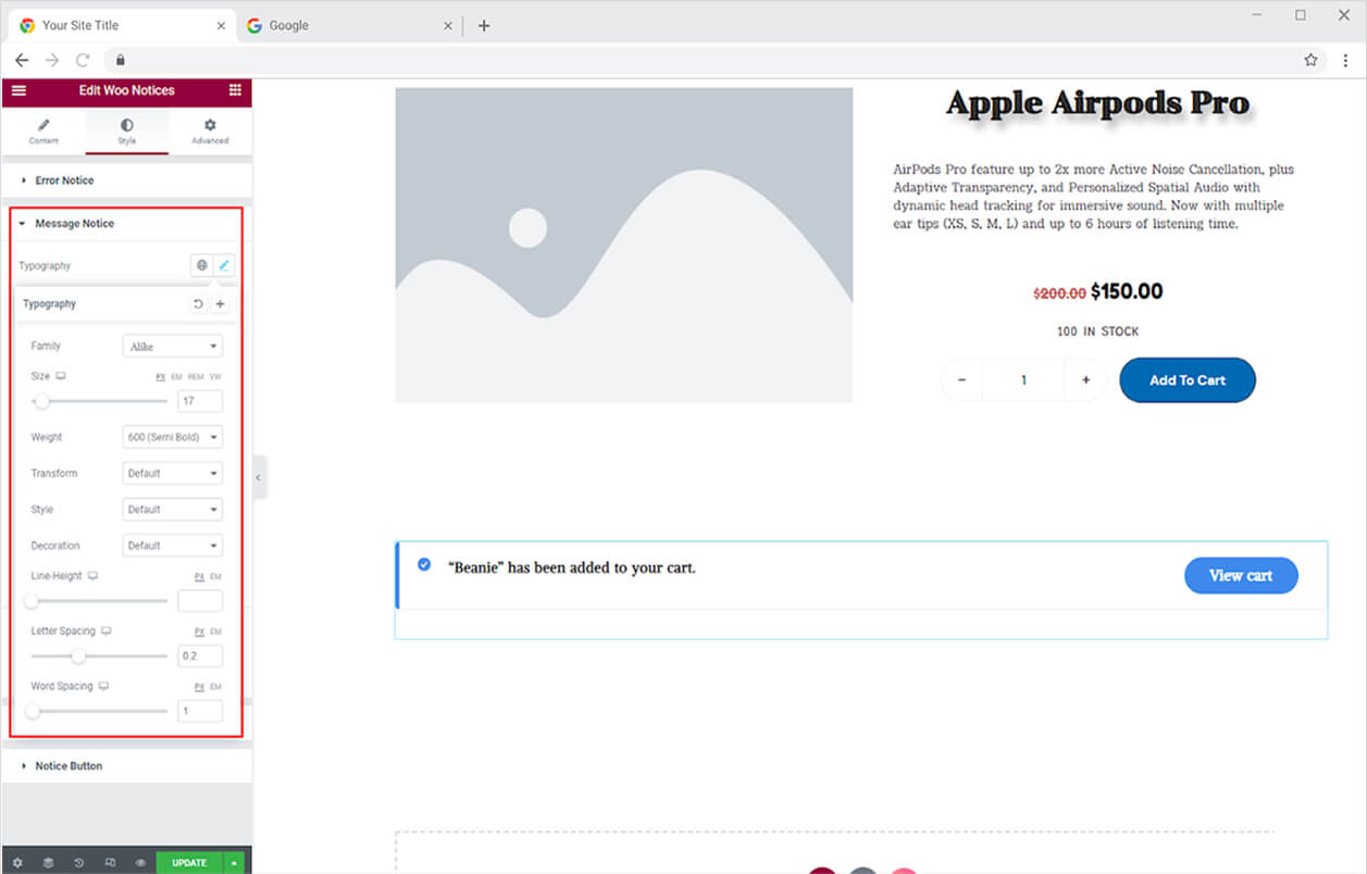 Let’s customize the Message Notice. Personalize the text typography by changing its font, size, weight, letter spacing, word spacing, and other text styles to your requirement.