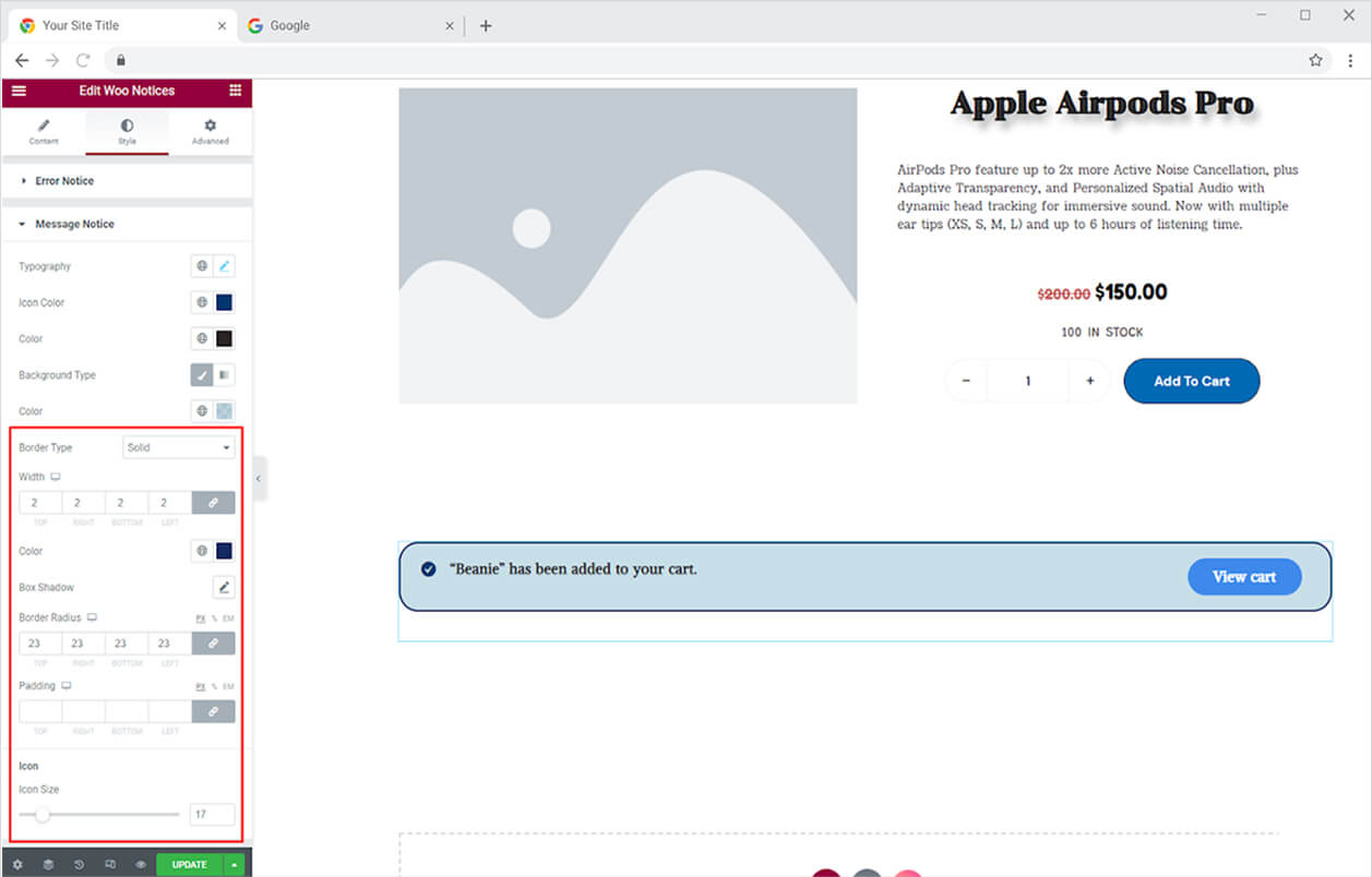 Change the width and radius of the border to match your preferences. You can also change the border color. Give a shadow to the Notice layout with the Shadow Box. Furthermore, adjust the icon size in the Error Notice display.