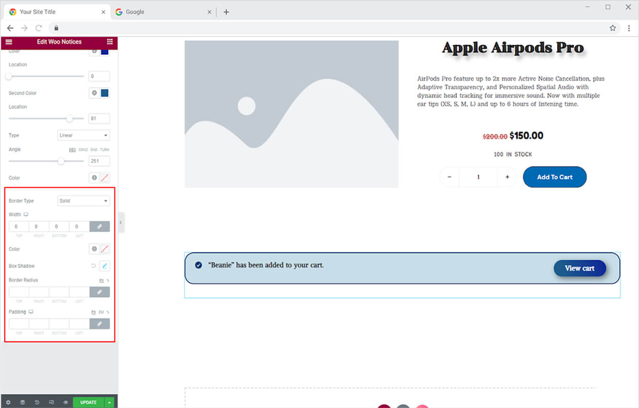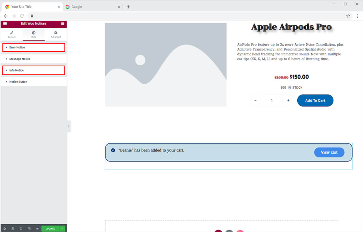 Woo Notices widget by Xpro Elementor gives a notification to the customer after he/she completes adding the product data they want to purchase. It informs customers that the item has been put in the cart, or if they have missed something, it informs them of the error. In order to use the Xpro WooCommerece widgets you must have installed the WooCommerce plugin in your WordPress.